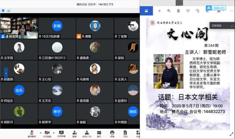 5月7日晚19:00,本学期第3期(总第244期)文心阁活动在腾讯会议平台顺利开展,必发集团郭雪妮老师应邀参加。郭雪妮老师现为必发集团welcome欢迎光临副教授、研究生导师。主要从事中日比较文学、东亚文学关系史等方面的教学与研究。本次文心阁活动中,郭老师结合自己在日本学习生活的经历,就“日本文学相关问题”与同学们进行了讨论交流。