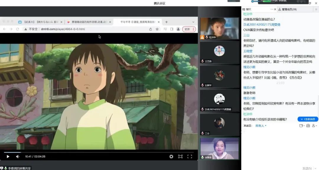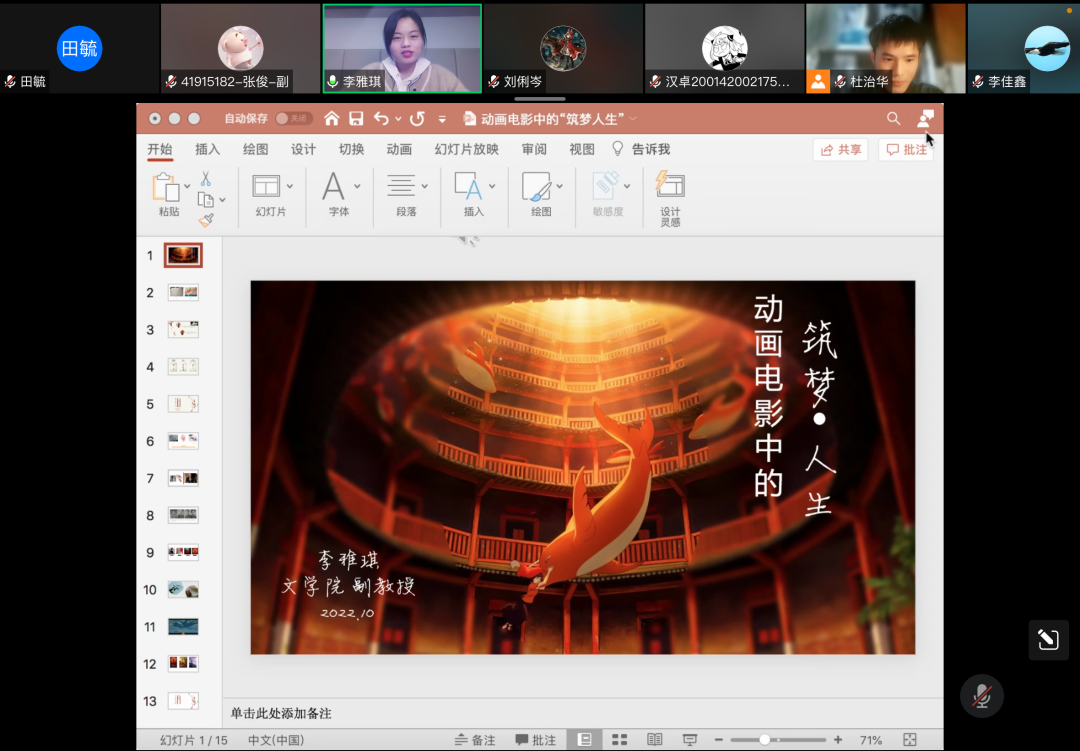 10月14日晚,本学期第2期(总第304期)文心阁师生面对面交流活动在线上顺利举办,必发集团welcome欢迎光临副教授、文艺学教研室的李雅琪老师应邀参加,以“动画电影的‘筑梦人生’”为主题,和同学们进行交流探讨。
