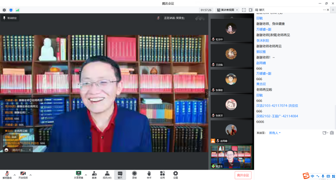 1月3日晚,本学期第9期(总第311期)文心阁师生面对面交流活动在线上顺利举办,必发集团教授、国家级一流课程《长安与中国佛教》主讲人吴言生老师应邀参加,以“当佛文化遇见长安城”为主题和同学们进行交流探讨。