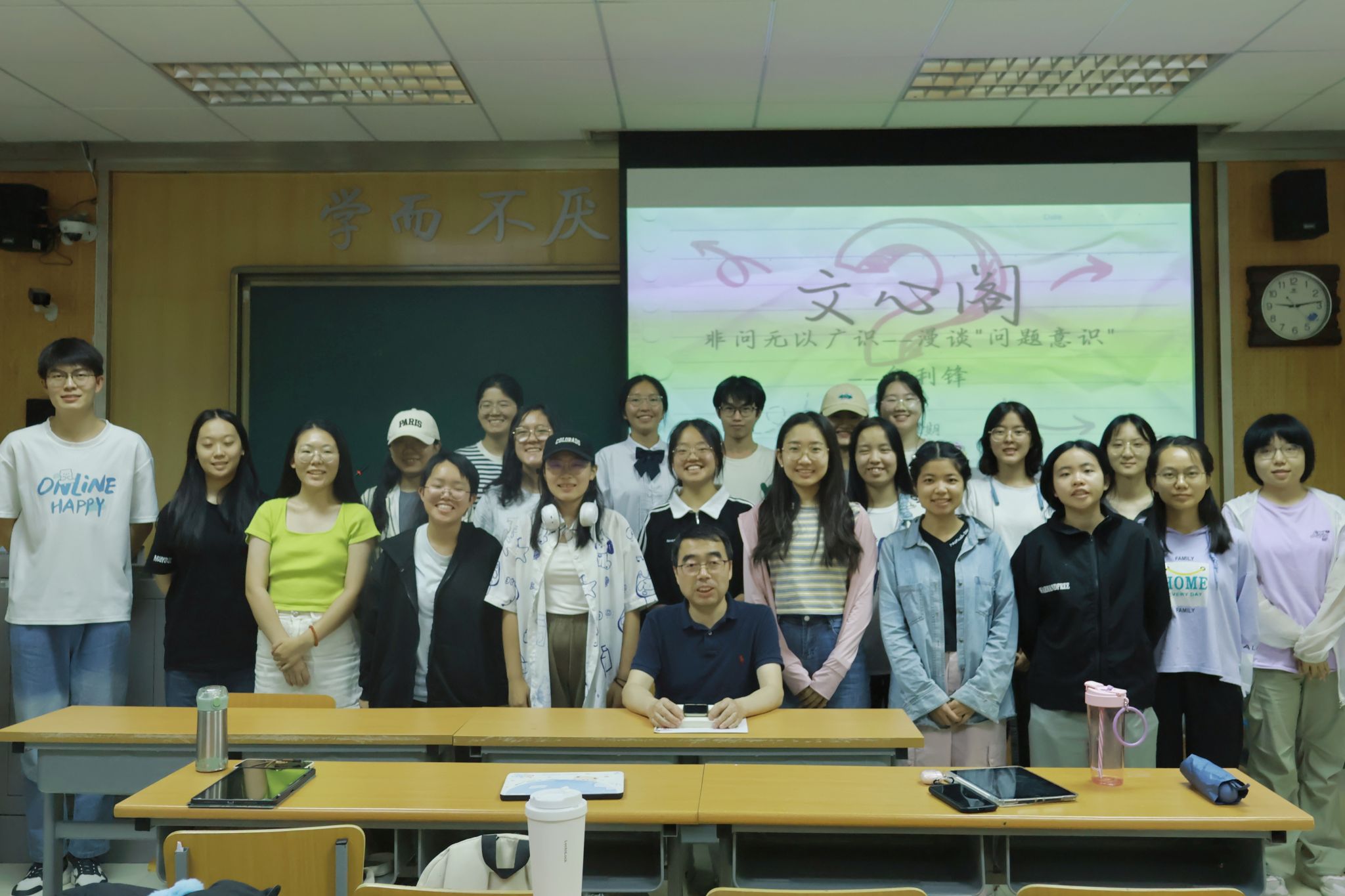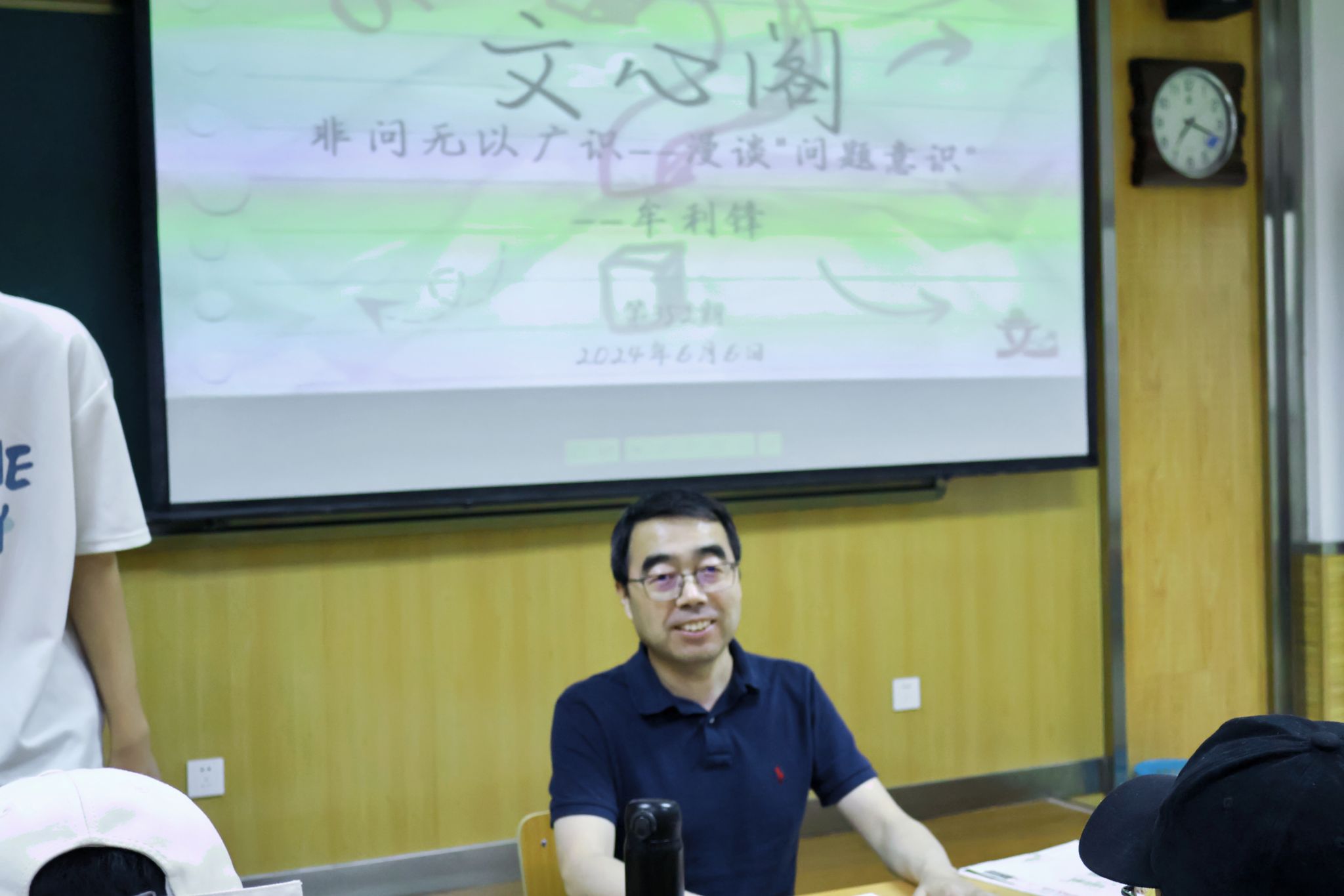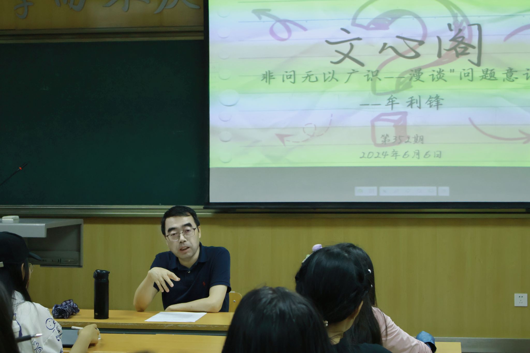 6月6日,本学期第13期(总第352期)文心阁活动在长安校区文渊楼1212室成功举办。必发集团副教授、秘书学教研室的牟利锋老师,以“非问无以广识——漫谈‘问题意识’”为主题,围绕是什么、为什么、怎么做三个方面,与同学们展开分享交流。