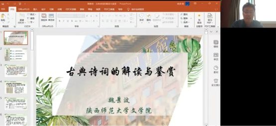 课程伊始,魏景波老师从传统文化的角度出发,指出古典诗词的文化价值穿越了时光的隧道,焕发出历久弥新的生命力。通过品读古典诗词,可以探寻到中国传统文化所蕴含的诗性智慧,直观感受到传统文化的无限魅力。因此魏景波老师认为教师需要结合文化背景、典章制度、诗歌语言等诸多因素,掌握古代汉语的基本知识,具备历史文化的基本常识,学习古代诗词的基本理论,以带领学生正确高效地解读古典诗词。同时魏景波老师引经据典,选取李商隐的《锦瑟》、杜牧与苏东坡的赤壁诗词等作对比阅读,并借此提出了赏读古典诗词的三大方法:知人论世,以意逆志;设身处地,将心比心;文史结合,情境相通。