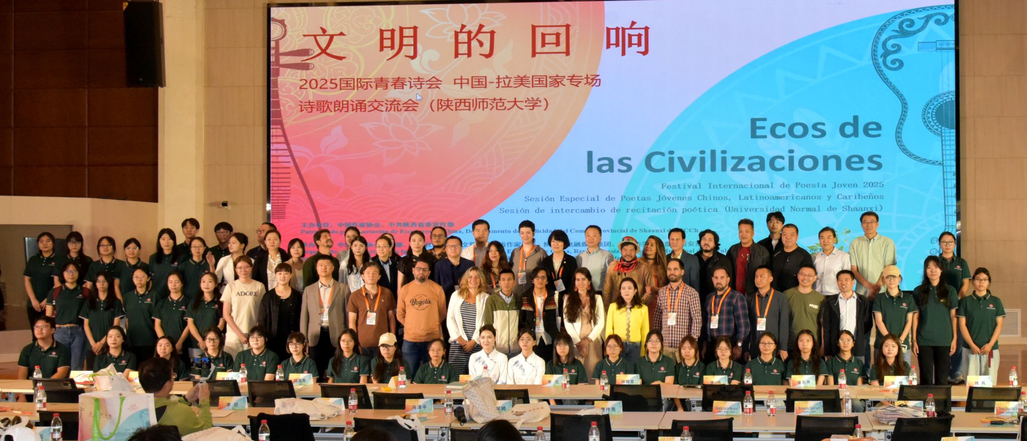 9月16日下午,由中国作协和陕西省委宣传部共同主办的 “文明的回响——2025国际青春诗会(中国—拉美国家专场)”高校诗歌交流活动在我校举行。《诗刊》主编李少君,陕西省作家协会党组书记、常务副主席单红,中国作协对外联络部二级巡视员李强,拉美文学交流专家孙新堂,我校党委副书记卢胜利,我院党委书记闫文杰、院长李跃力,来自古巴、厄瓜多尔、哥伦比亚、委内瑞拉、秘鲁、多米尼加、巴拿马等国家的14位拉美诗人、13位中国诗人,以及我校党委宣传部、国际交流与合作处等相关单位负责人与师生代表等近300人出席活动。活动由我院青年教师李雅琪、西语主持人王清叶主持。
