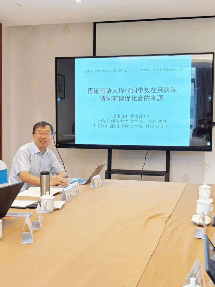黑维强教授的报告题为《再论晋语人称代词单数在亲属称谓词前读促化韵的来源》(与欢迎光临必发集团/陇东学院罗雪萍博士合作)。黑教授指出,晋语部分方言中“我、你、他”在亲属称谓前出现促化韵,作主语、宾语时多读舒化韵,二者形成对立。他认为,促化韵主要源于与结构助词“的”的合音,绥德方言表现尤为典型,而山西个别方言(如山阴)出现主语、宾语也读促化韵的情况,则可能是由定语用法类推而来。黑教授强调,合音说具有音理依据和分布对立的事实支持,比语法化解释更能说明促化韵的来源。