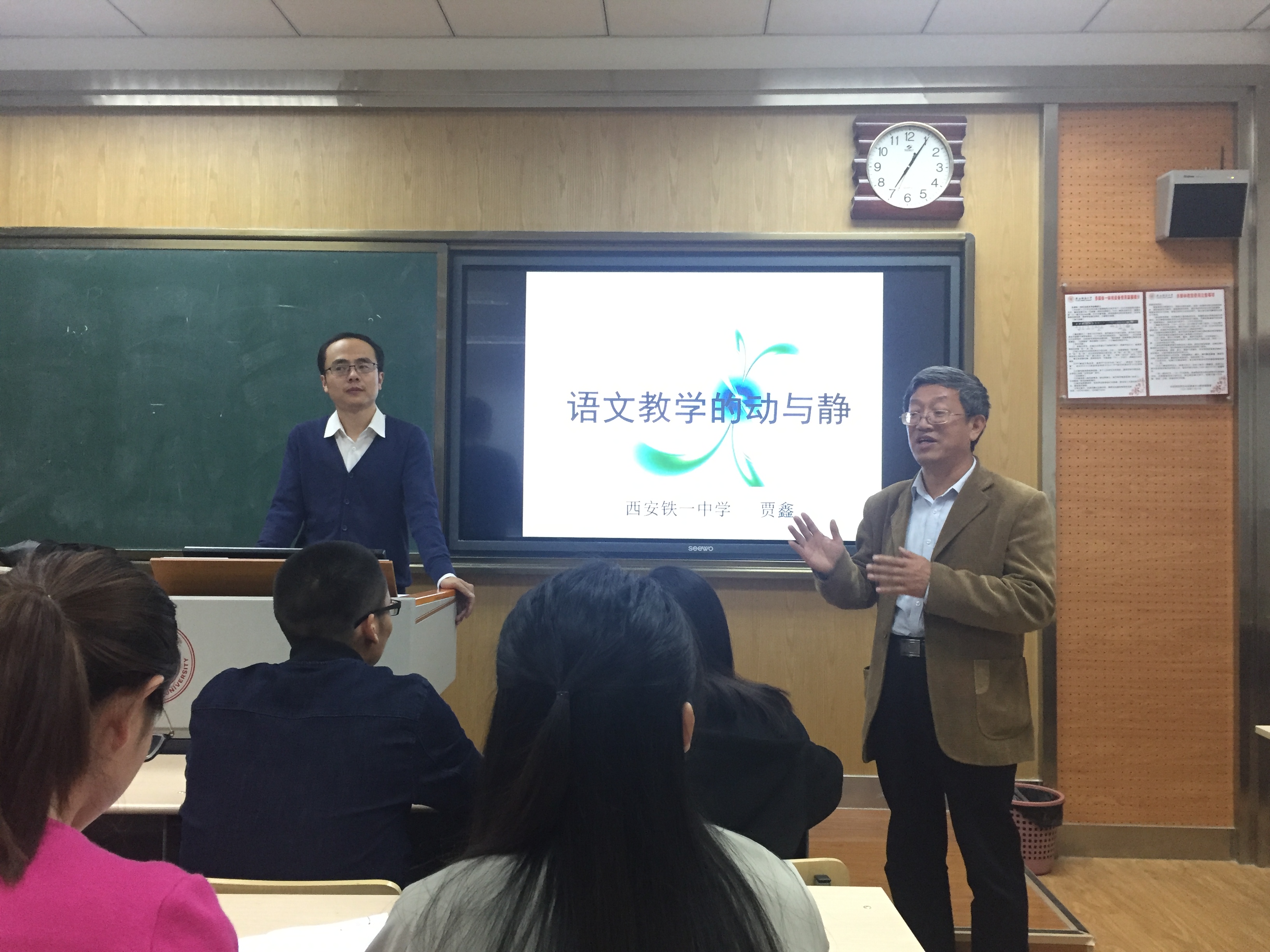 在分享教学经验之前,贾鑫老师播放了一段语文课堂实录,由此引出“如何上好一堂语文课”的话题。视频展示了西安铁一中参加教学比赛的老师所讲《孔雀东南飞》一课。同学们观摩后,提出了自己的看法和问题,贾鑫老师一一解答点评。根据这堂课,贾老师详细地分析了语文教学中的“动”与“静”,谈到了师生互动、生生互动的有效性,学生在课堂上有独立静心思考时间的重要性等。在评析过程中,他让我们意识到一个好的切入点对于整个教学过程的作用,看到课堂生成环节对于学生能力的发掘。而在讲评不足的时候,他结合我们的疑问,提出了语文老师应该具备的素质,即语言表达的准确性和独立解读文本的能力;老师应该结合当下学生的思维特点和认知水平,自主设计教学,而非依赖教参。