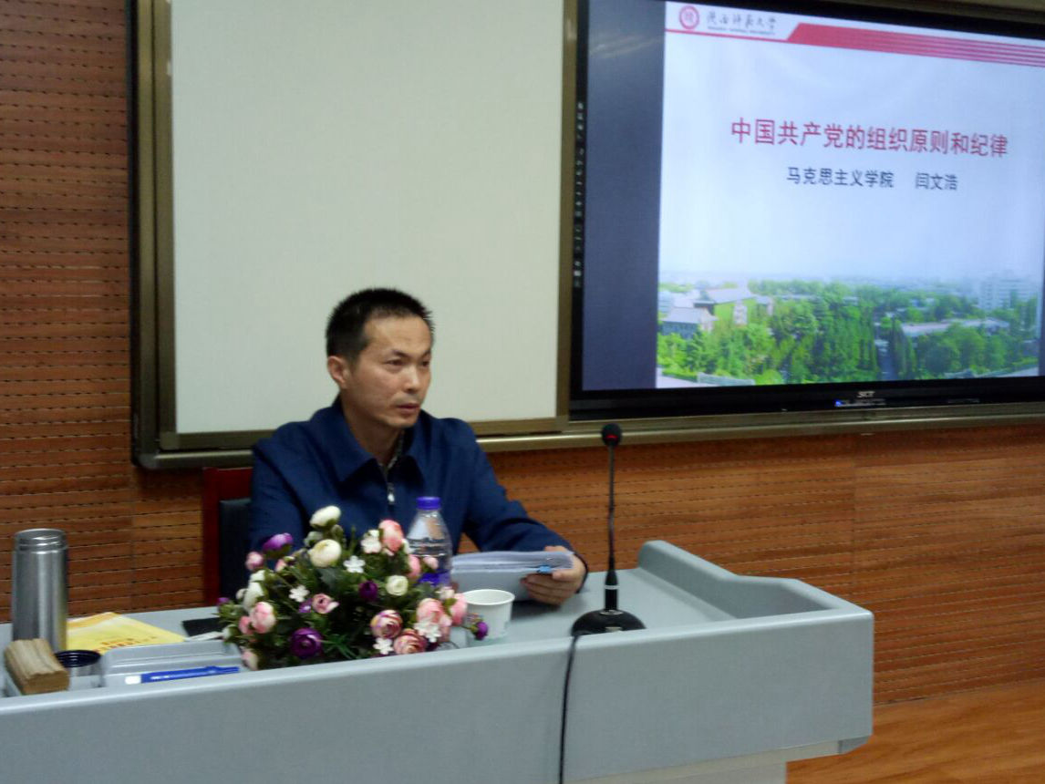 闫老师以“中国共产党的组织原则和纪律”为主题,详细讲解了我党的组织制度和严明的组织纪律。他认为,理解党的纪律就是党的生命,只有坚持纪在法前,纪严于法,才能开创全面从严治党的新境界。他强调,要准确把握民主集中制的科学内涵,并把坚持完善民主集中制作为积极发展党内民主的重要前提。党的组织制度和纪律是党为了加强党的建设而确立的各项规则,是党的各级组织和全体共产党员在党的活动中必须共同遵守的工作规范和行动准则,是维护党的团结统一,完成党的任务的保证。最后,老师还介绍了党的三大优良作风,提出要以贯彻中央八项规定为切入点,反对形式主义,奢靡主义等不正之风,使党永葆生机与活力。