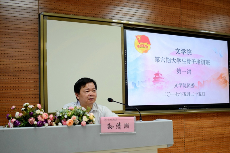 (通讯员:陶路江 审核:辛田)为提高大学生骨干理论和思想觉悟水平,5月25日下午15时,我院第六期大学生骨干培训班开班仪式在文汇楼A区102教室举行。我院党委书记孙清潮,党委秘书辛田,辅导员谭诗民、程海峰、秦亚坤出席,活动由辛田主持。 开班仪式上,全体起立奏唱团歌,我院党委秘书辛田介绍了本期培训班的培训计划和安排、学员构成和分组等情况。学员代表、2015级汉语言文学专业王富玉同学发言,代表全体大骨班同学表示一定认真听课,按要求阅读书目、并完成实践教学内容,切实完成培训任务。 本次大骨班第一讲由我院党委书记孙清潮老师主讲。孙老师以“大学生需要具备政治敏锐性”为主题,为同学们作报告。他认为,爱国主义教育是提高全民族整体素质和加强社会主义精神文明建设的基础性工程,是引导人们树立正确理想、信念、人生观、价值观的共同基础,是全社会一项十分重要的工作。而这一工作的重点就是青少年,因此,加强对大学生的爱国教育,培养爱国主义精神,具有极其重要的现实意义。他指出,提高大学生理性爱国的认识是必不可少的,作为国家未来建设的希望和主力军,大学生不仅要在合法的途径和政府支持的前提下积极表达爱国情感,同时也需要时刻关注全球局势变化、了解国家发展、提高个人政治素养。他希望本次培训学员要敢为人先,做好榜样。具备良好的政治敏锐性,时刻保持一颗清醒的头脑、保持理性;同时,也要努力工作和学习,提高个人综合素质,做对国家有用的人。之后,学员们现场提问后,第一讲圆满结束。