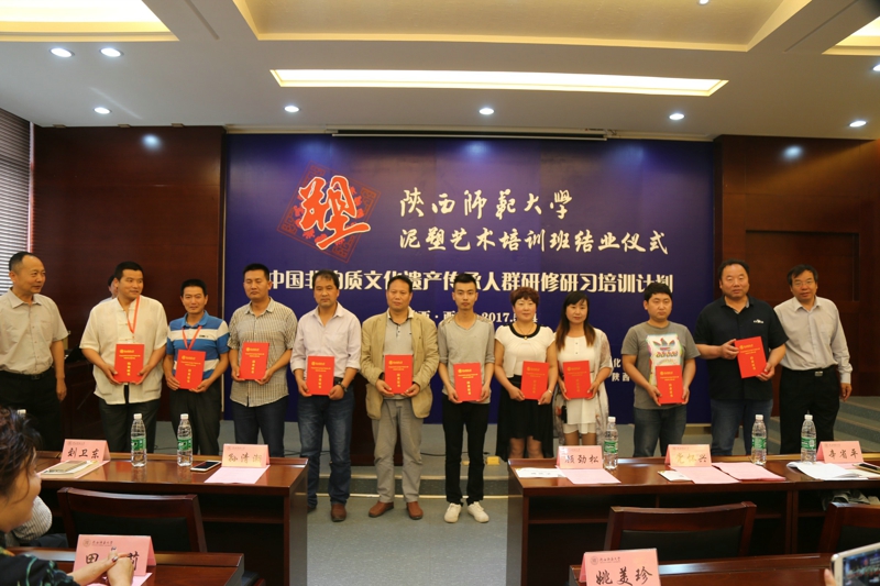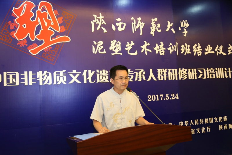 在结业仪式上,来自陕西扶风县的泥塑传承人王百让和陕西杨陵区的古建筑壁画高级营造师马发虎,分别作为学员代表与大家一起分享了为期一个月的学习心得。他们从自身经历谈起,讲述了自己泥塑人生的艰辛与坚守,以及在陕西师大参加培训学习的感悟和收获,情到深处,几度哽咽,令现场许多学员落泪。