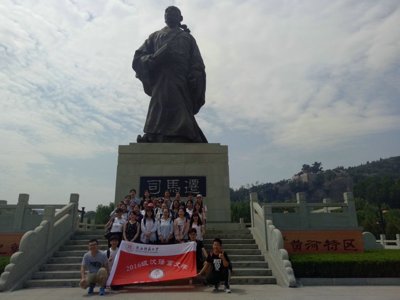同学们首先来到韩城参观了太史公祠。进入广场,就看到甬道两边有12个雕像,展现了《史记》中的十二本纪中所记载的故事。太史公塑像端立场中,双目如炬、刚毅凌然。跨过颓旧沧桑的芝秀桥,便是太史公祠。太史公祠建在一座山岗上,居高临下,气象雄浑。入门走上司马坡,古道用石块堆砌而成,历经漫长风雨洗礼已是凹凸斑驳,见证着过往的历史。山腰有一木质牌坊,上书“高山仰止”四个刚劲有力的大字,准确地评价了司马迁的一生。接着,同学们参观了关于司马迁的两个展馆,结合相关史料更近一步地了解了司马迁的一生。经过99级石阶,同学们到达太史公祠,院中古柏参天,庄严肃穆,碑石林立,许多名人曾来这里拜访和题字。穿过磨盘路,最终到达太史公墓,这是由许多磨盘砌成的一条小路,借磨盘一年四季不间断地转动比喻司马迁书写《史记》时的艰难。“人固有一死,或重于泰山,或轻于鸿毛”。太史公为史而生,其死固重于泰山,其名更流芳百世。最后,16级汉文卓越班全体学生又参观了党家村和黄河龙门景区,感受古民居的古朴淳厚、传统文化的完美保留与传统精神的弘扬传承;探访大禹治水、鲤鱼跃龙门传说的发源地。