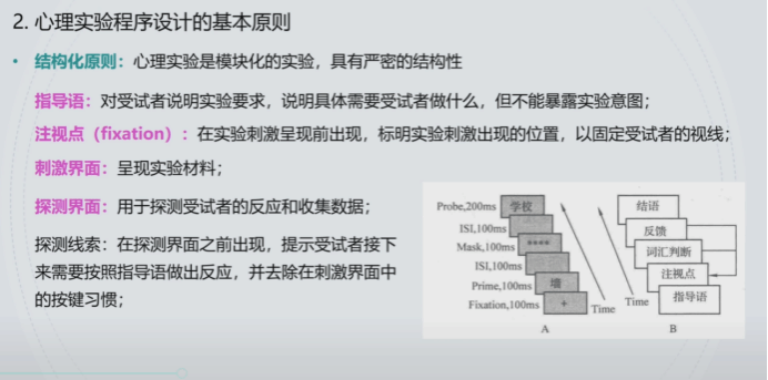 王老师首先用一个“押韵判断实验”让大家对感知实验形成直接感受,然后开始详细介绍Eprime的功能,心理实验的基本原理、基本原则和各项流程。例如结构化原则和模式化原则,指导语和结束的必要性,注视点和刺激界面的设定。