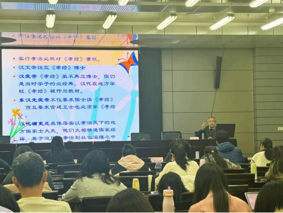 与谈环节,周淑萍教授总结认为韩星教授本次讲座内容丰富,视野宏大,且具有现实的关怀。《孝经》对我们的文化具有根脉性的影响,其内涵绝不是狭隘的愚孝。党怀兴教授指出,我们正处在大力弘扬中华优秀传统文化的好时代。习近平总书记提出要将马克思主义基本原理同中华优秀传统文化相结合,我们要理直气壮地传承中华优秀传统文化,传承《十三经》中的核心思想,从中汲取智慧,延续中华文化基因。我们要知道感恩,孝敬父母,忠于国家,立德修身。郝杰老师结合自己普及优秀传统文化的亲身经历,认为“孝”是立德之本,要自觉践行。