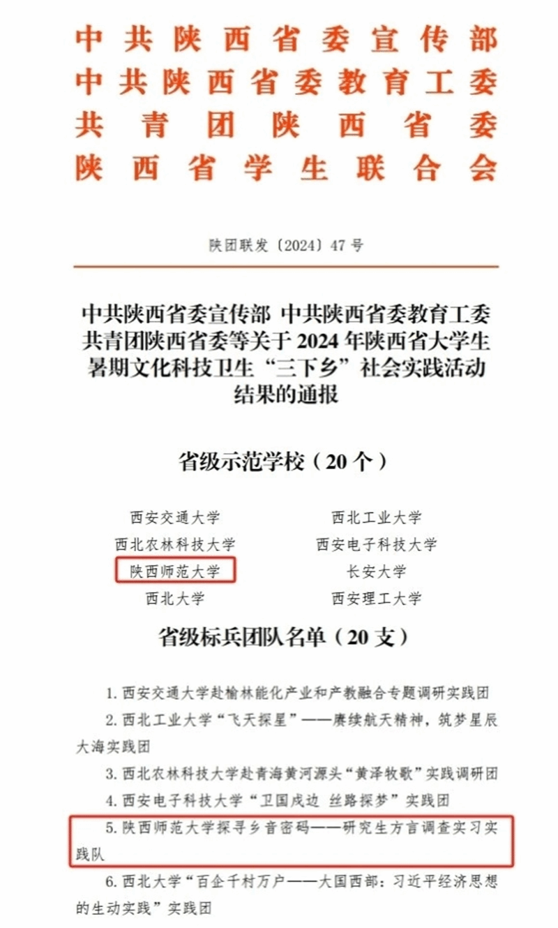 师大新闻网讯:近日,陕西省委宣传部、陕西省委教育工委、共青团陕西省委等下发《关于2024年陕西省大学生暑期文化科技卫生“三下乡”社会实践活动结果的通报》,在陕西省大学生暑期文化科技卫生“三下乡”社会实践活动中,我院“探寻乡音密码——研究生方言调查”实习实践队获评“省级标兵团队”。