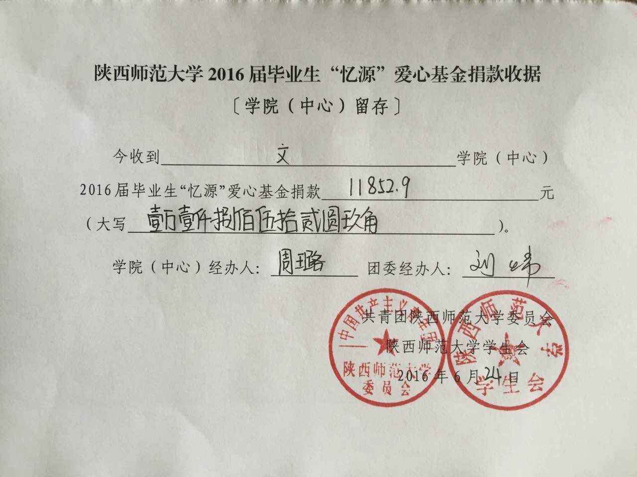 我院2016年“忆源”爱心基金募捐工作已经结束。2016年7月,我院将有399名本科生,166名硕士生,20名博士生毕业生离校。在全体毕业生的大力支持下,我院291名本科毕业生、141名硕士毕业生、7名博士毕业生、2名辅导员共为爱心基金捐款11852.9元,其中,本科生捐款6455.9元,研究生捐款5397元。学院团委已将所有款项全数交给校团委。在此,感谢各位毕业生对学院和学校工作的支持、对即将入学的2016级学弟学妹的帮助,祝愿全体毕业生生活愉快,前程似锦!