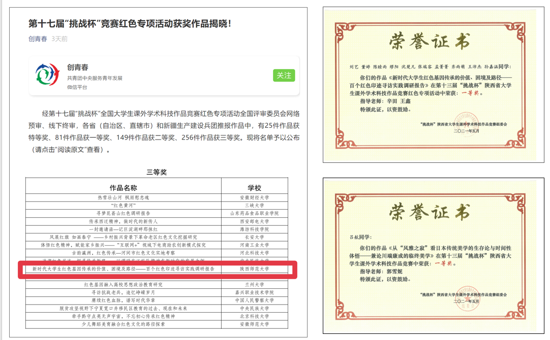 第十七届“挑战杯”全国大学生课外学术科技作品竞赛红色专项,全国共报送参赛作品11184件,我院报送的作品《新时代大学生红色基因传承的价值、困境及路径——百个红色印迹寻访实践调研报告》荣获全国三等奖、陕西省一等奖,是我校获红色专项全国奖项唯一作品。作品由辛田、王鑫指导,团队负责人为刘艺,团队成员包括王沛杰、陈睦雨、沈楚凡、缪阳、齐雨萌、孙嘉涵、孟菁菁、张端容、董婷。