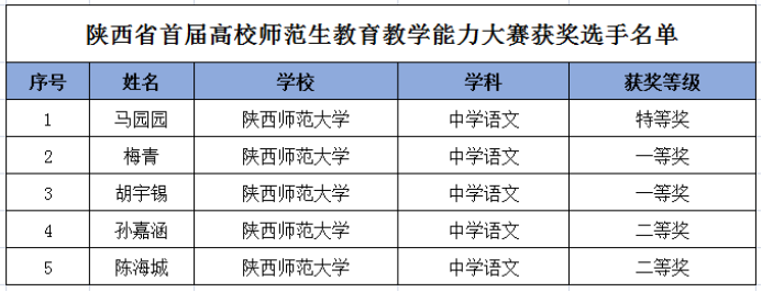 (通讯员:文苑)2022年5月27至29日,陕西省首届高校师范生教育教学能力大赛决赛顺利举办。根据决赛成绩,中学语文组共评选特等奖1名、一等奖5名、二等奖10名,优秀奖4名。其中我院师范生马园园斩获特等奖,梅青、胡宇锡获一等奖,孙嘉涵、陈海城获二等奖。